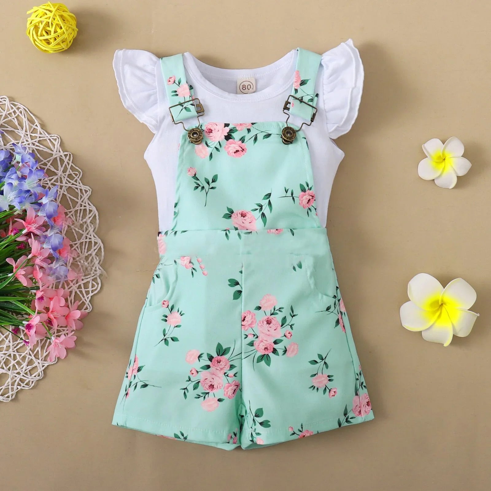 Toddler girl outfit with white flutter sleeve top and mint green floral print overalls on beige background