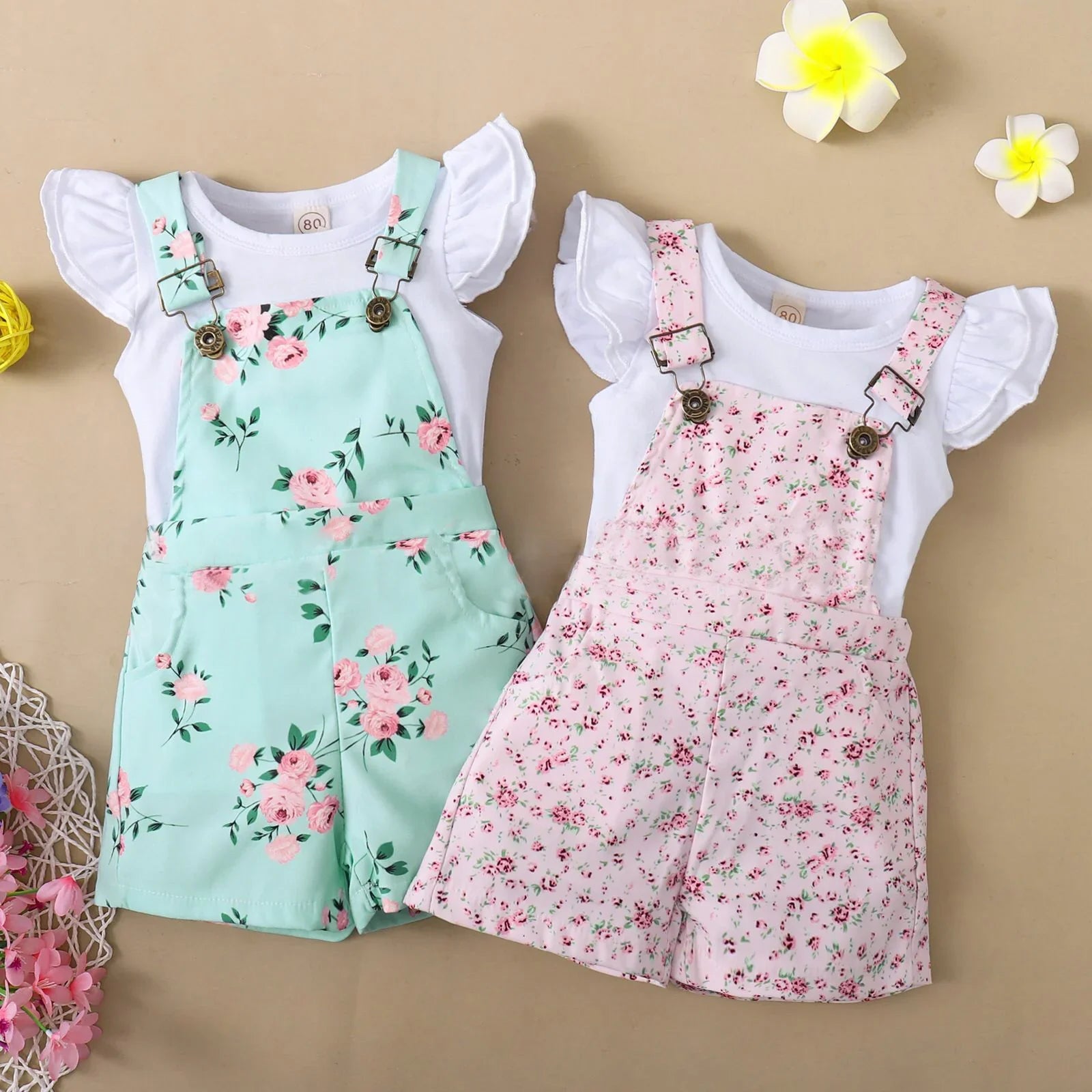 Two floral print short overalls for toddlers with white ruffled sleeve shirts, one in mint green and the other in pink, on beige background