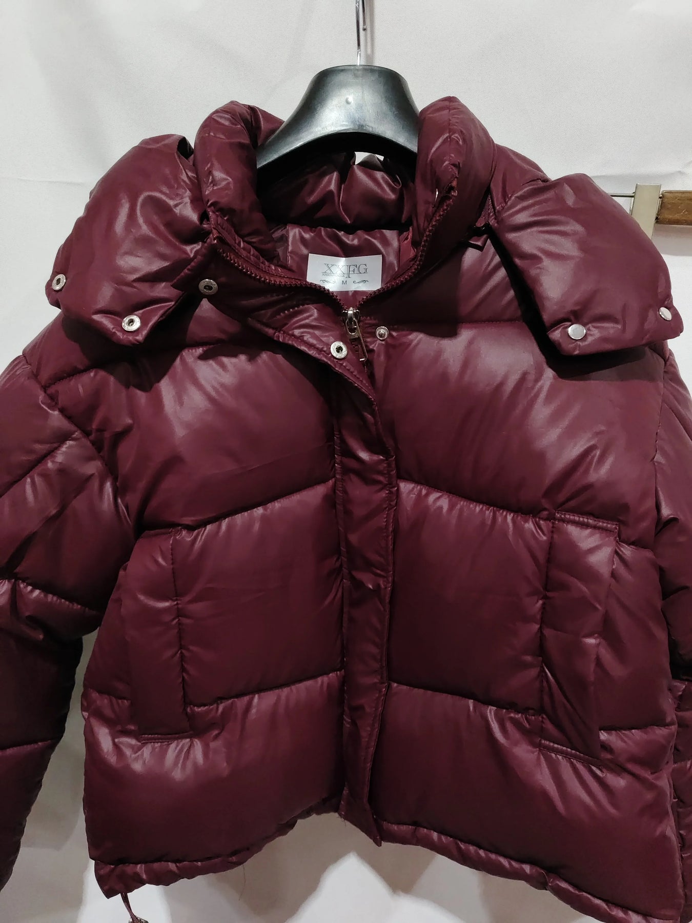 Maroon puffer jacket with high collar and snap buttons on hanger