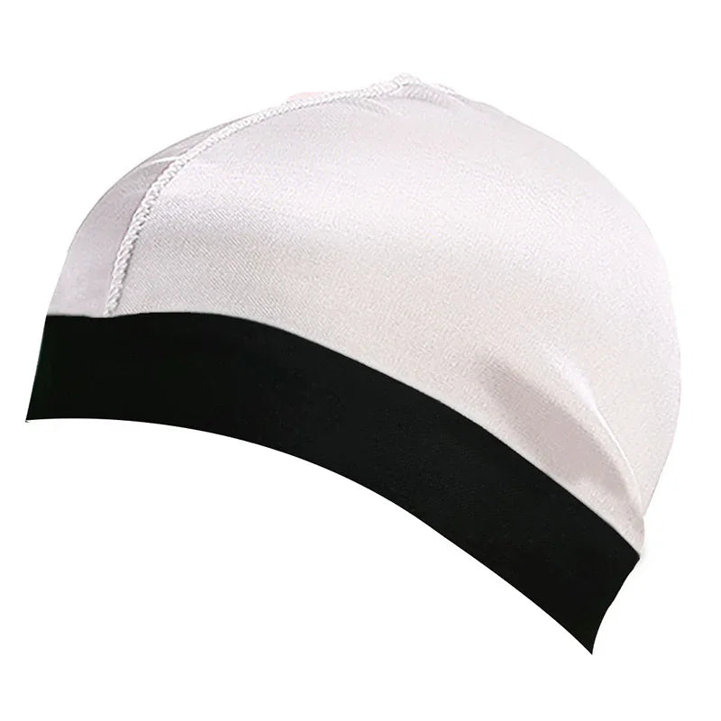 White swim cap with black band, seamless stretch fabric for swimming and water sports