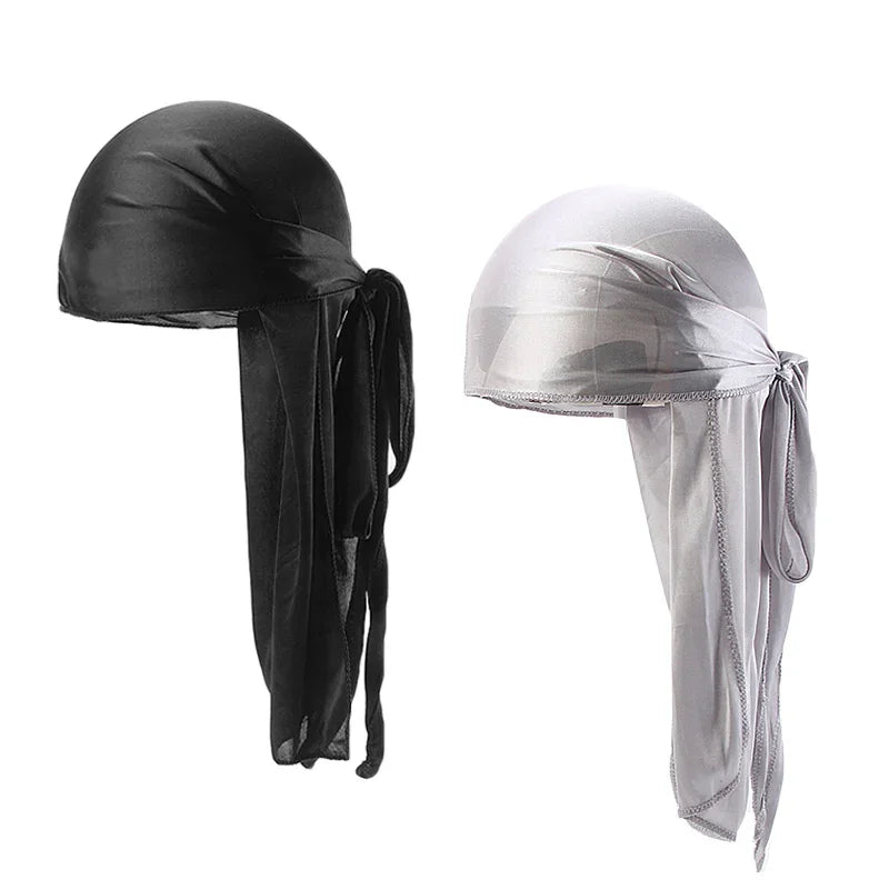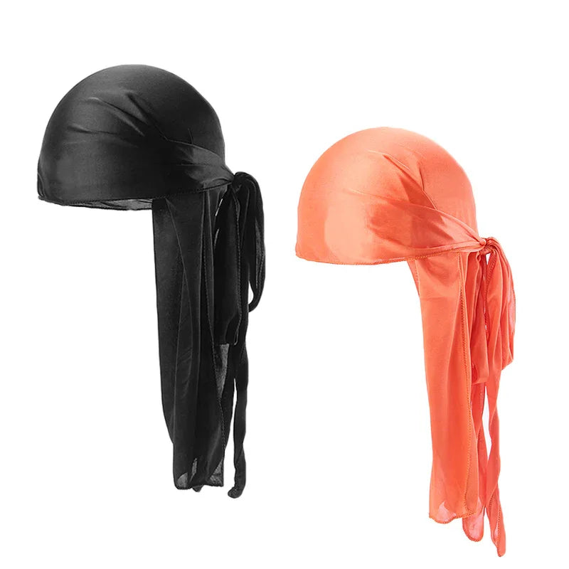 Black and pink silky durag headwraps with long tails tied at the back on white background