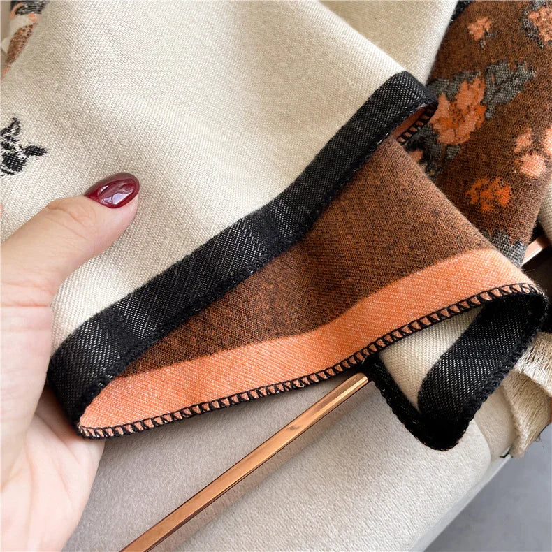 Close-up of a hand holding a folded beige, brown, and orange patterned wool scarf with black edges