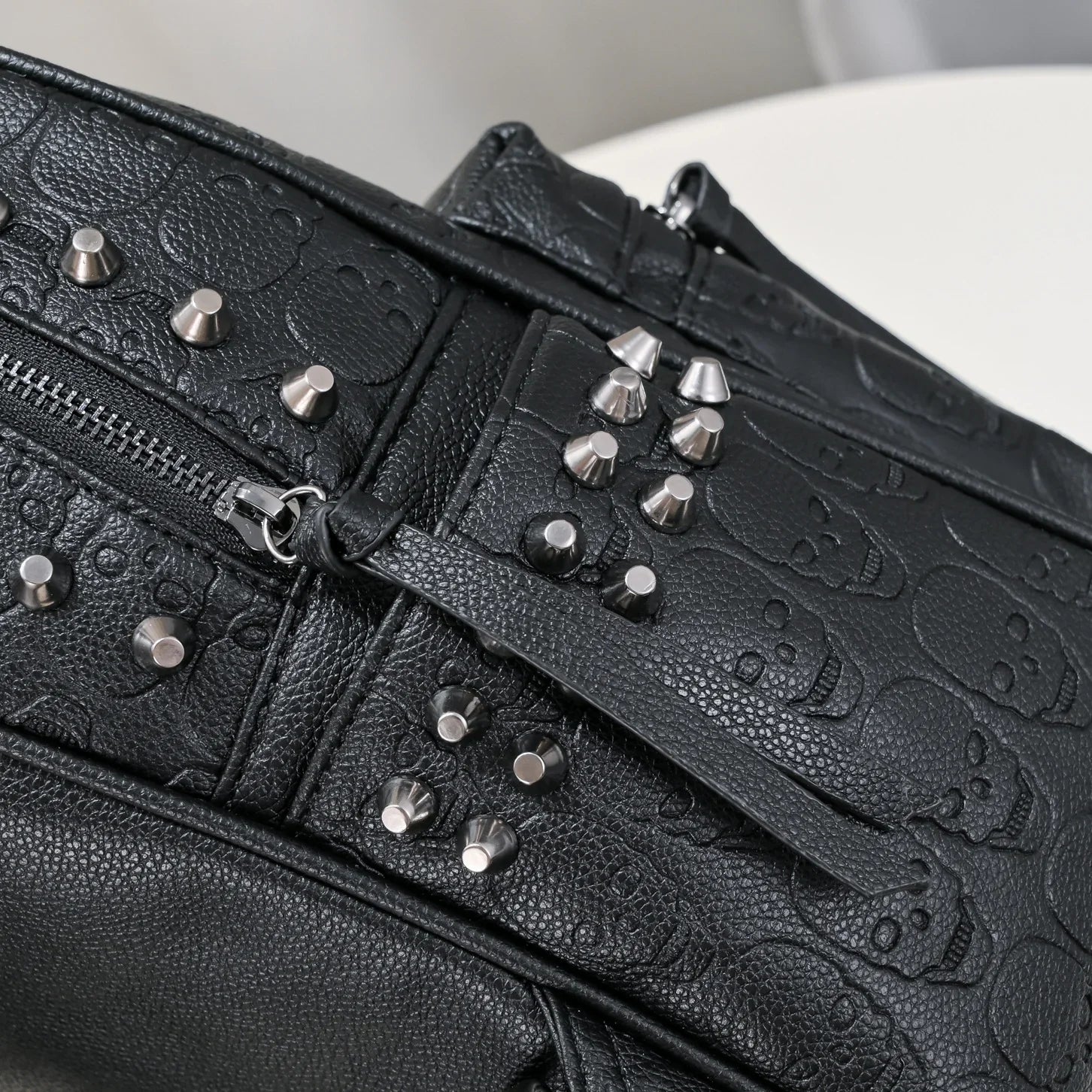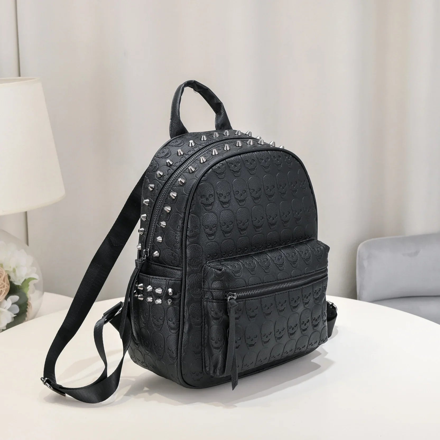 Black leather backpack with embossed skull pattern and silver spike studs on the top and sides