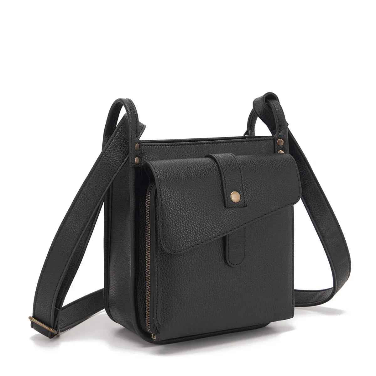 Black leather crossbody bag with flap, snap button, front zipper pocket, and adjustable strap