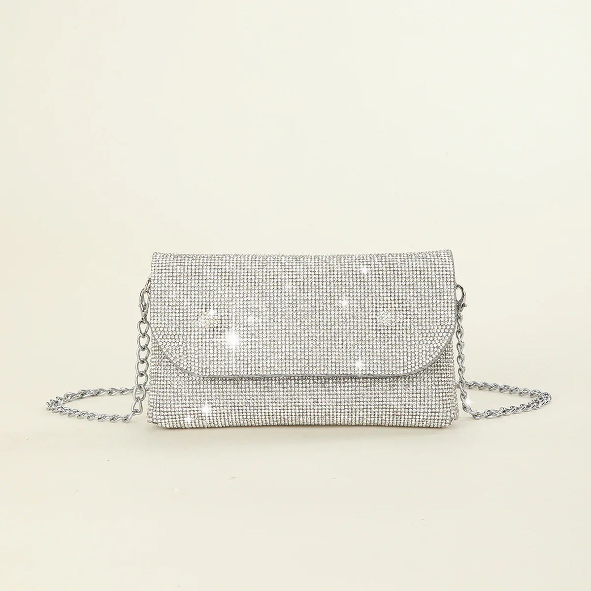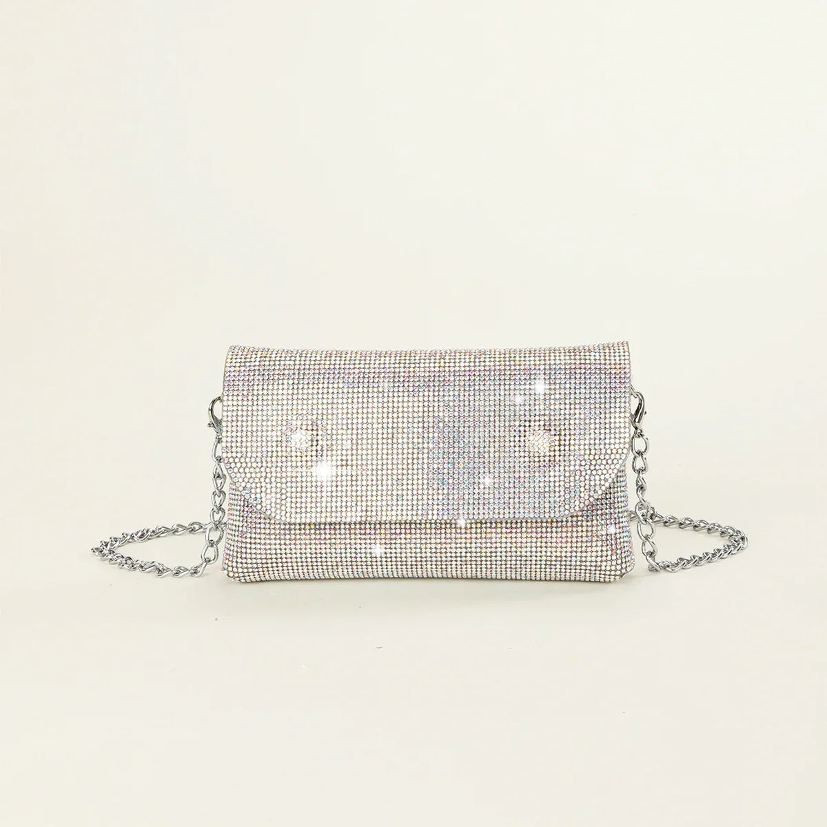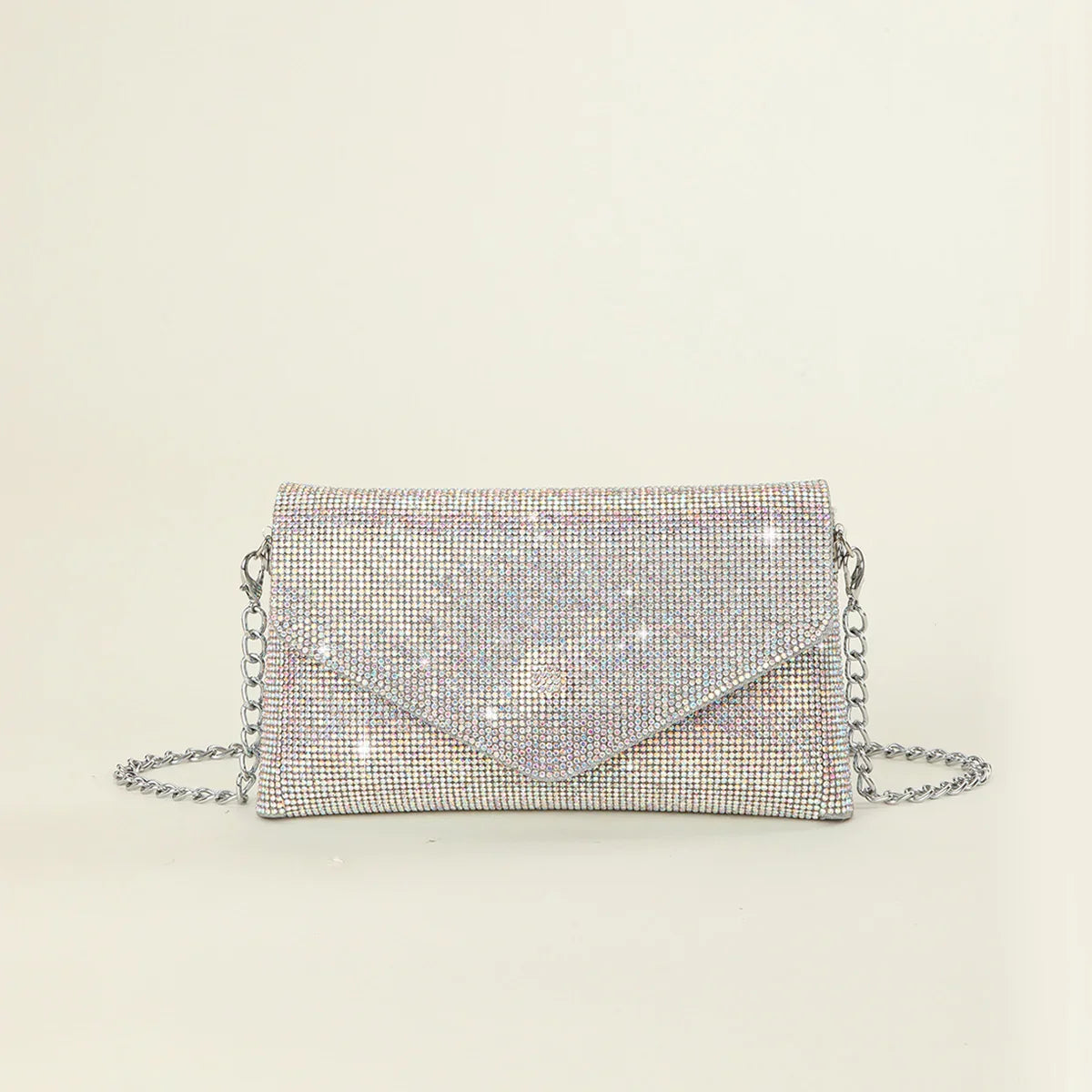 Silver rhinestone envelope clutch bag with chain strap glittering on white background