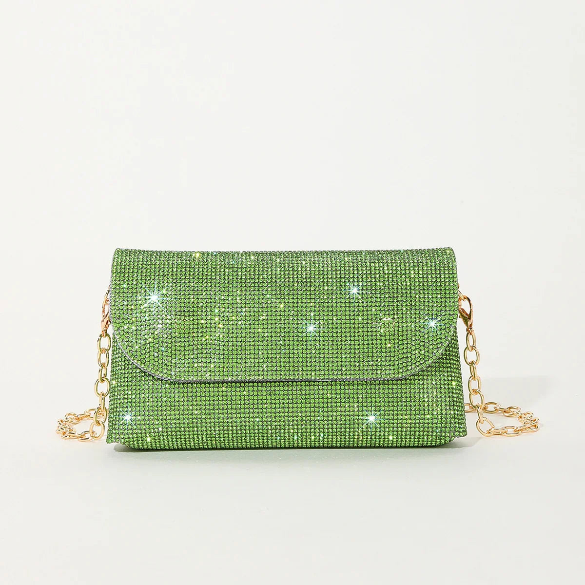 Sparkling green rhinestone clutch bag with gold chain strap on white background