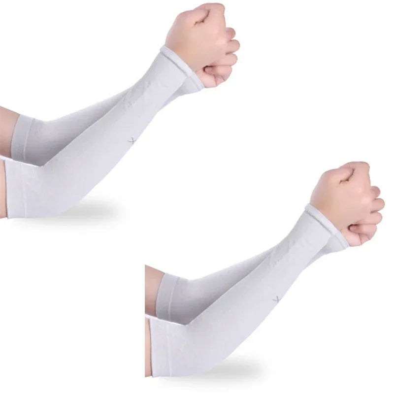 Pairs of white and light gray cooling arm sleeves worn on forearms with hands in fists