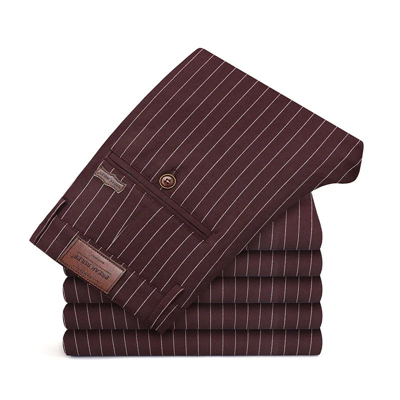 Stack of folded brown pinstripe dress pants with buttoned back pocket and leather label