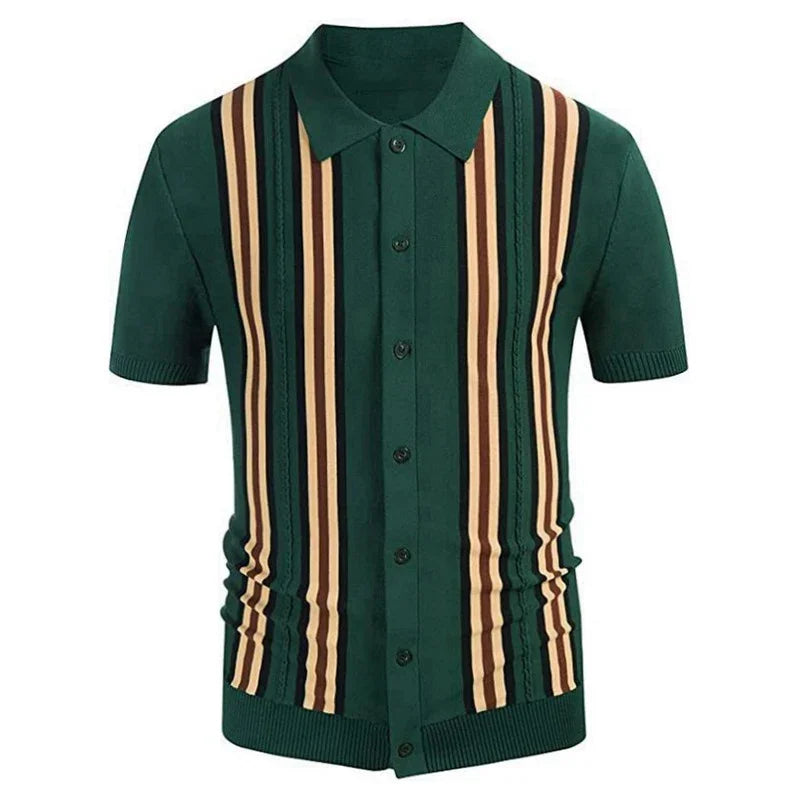 Green short-sleeve button-up polo shirt with vertical beige and black stripes