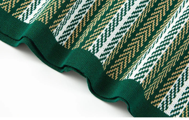 Close-up of green, white, and yellow knit sweater fabric with zigzag pattern and green collar