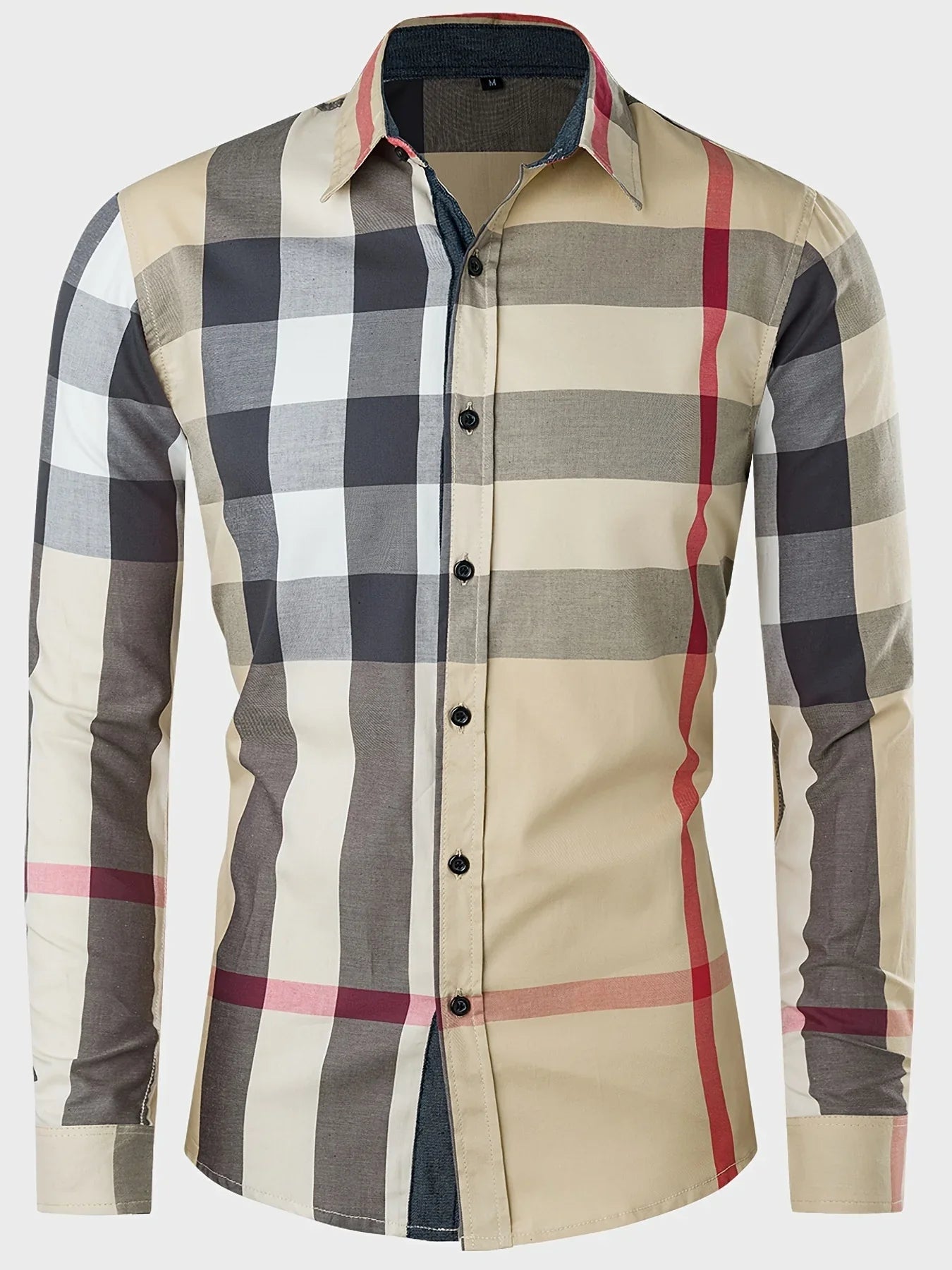 Men's slim fit button-down plaid shirt in beige, black, white, and red check pattern
