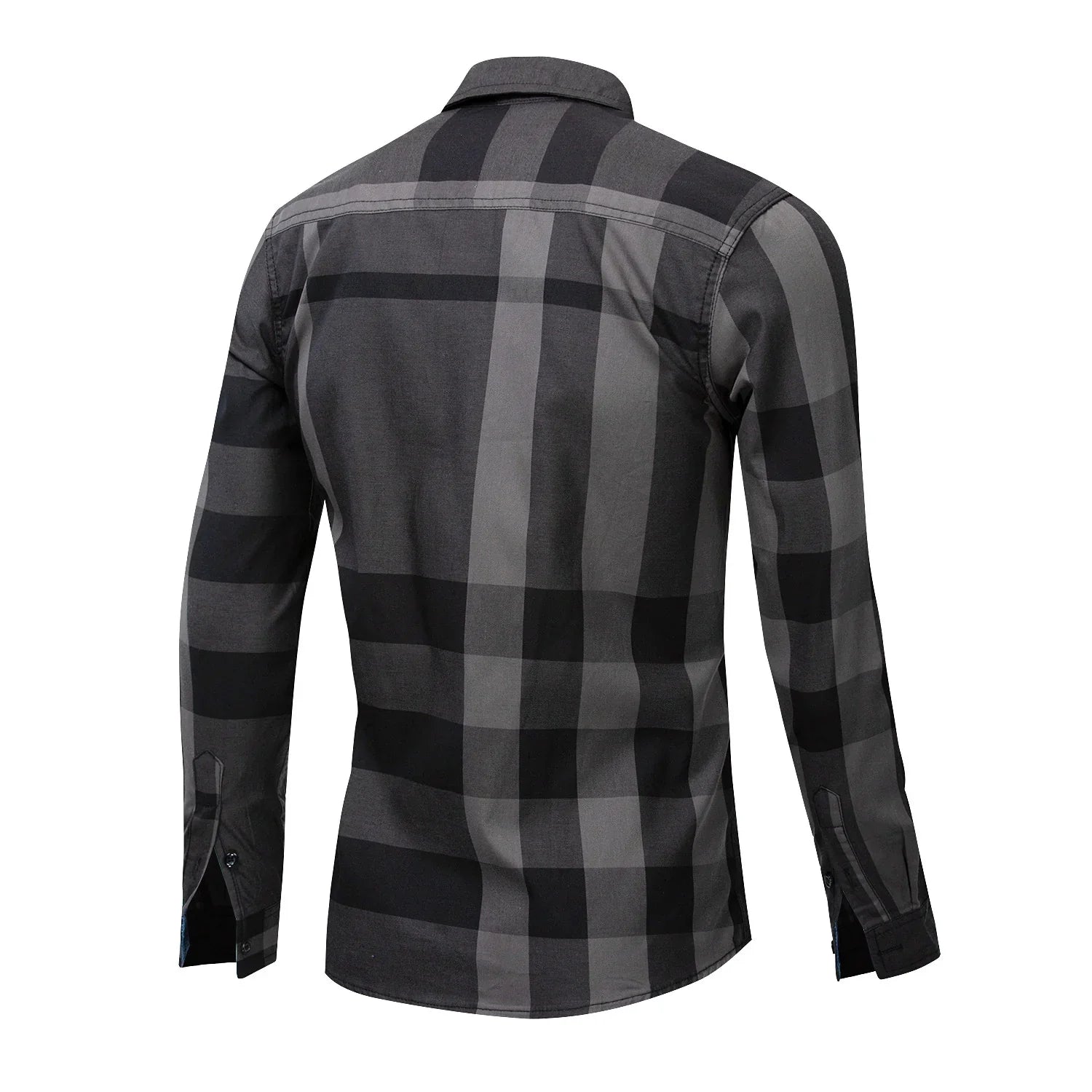 Back view of long-sleeve black and grey checkered flannel shirt with collar