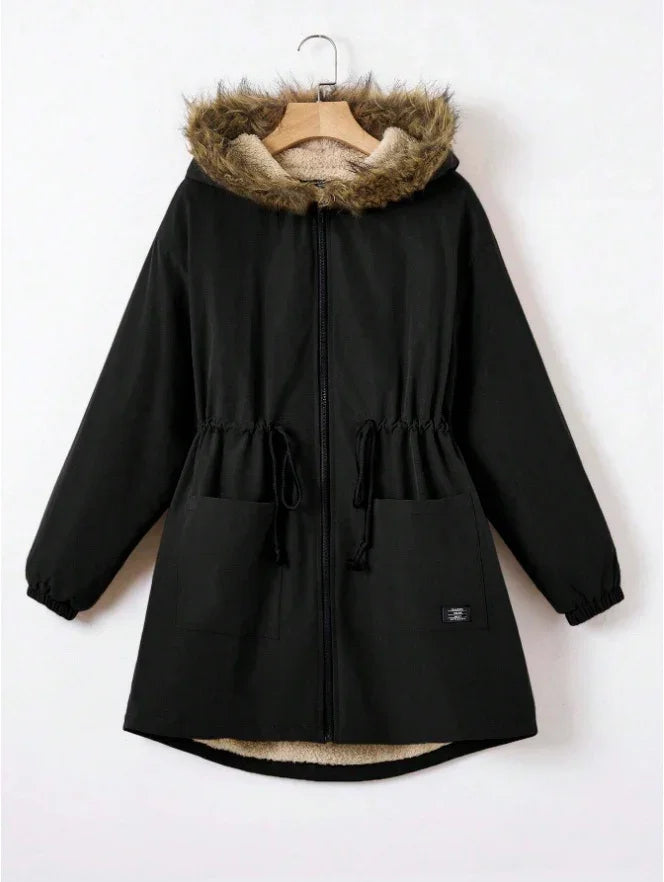 Black winter jacket with faux fur hood, front zipper, drawstring waist, and large pockets