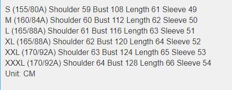 1. Les tailles asiatiques sont 1 à 2 tailles plus petites que les tailles européennes et américaines. Si vous hésitez entre deux tailles, choisissez la plus grande. Veuillez prévoir une marge d'erreur de 2 à 3 cm due à la mesure manuelle. 2. Veuillez consulter attentivement le tableau des tailles avant d'acheter l'article. Si vous ne savez pas quelle taille choisir, veuillez contacter notre service client. 3. Comme vous le savez, les couleurs affichées sur votre écran peuvent varier. La couleur de l'article réel peut donc être légèrement différente des images présentées.