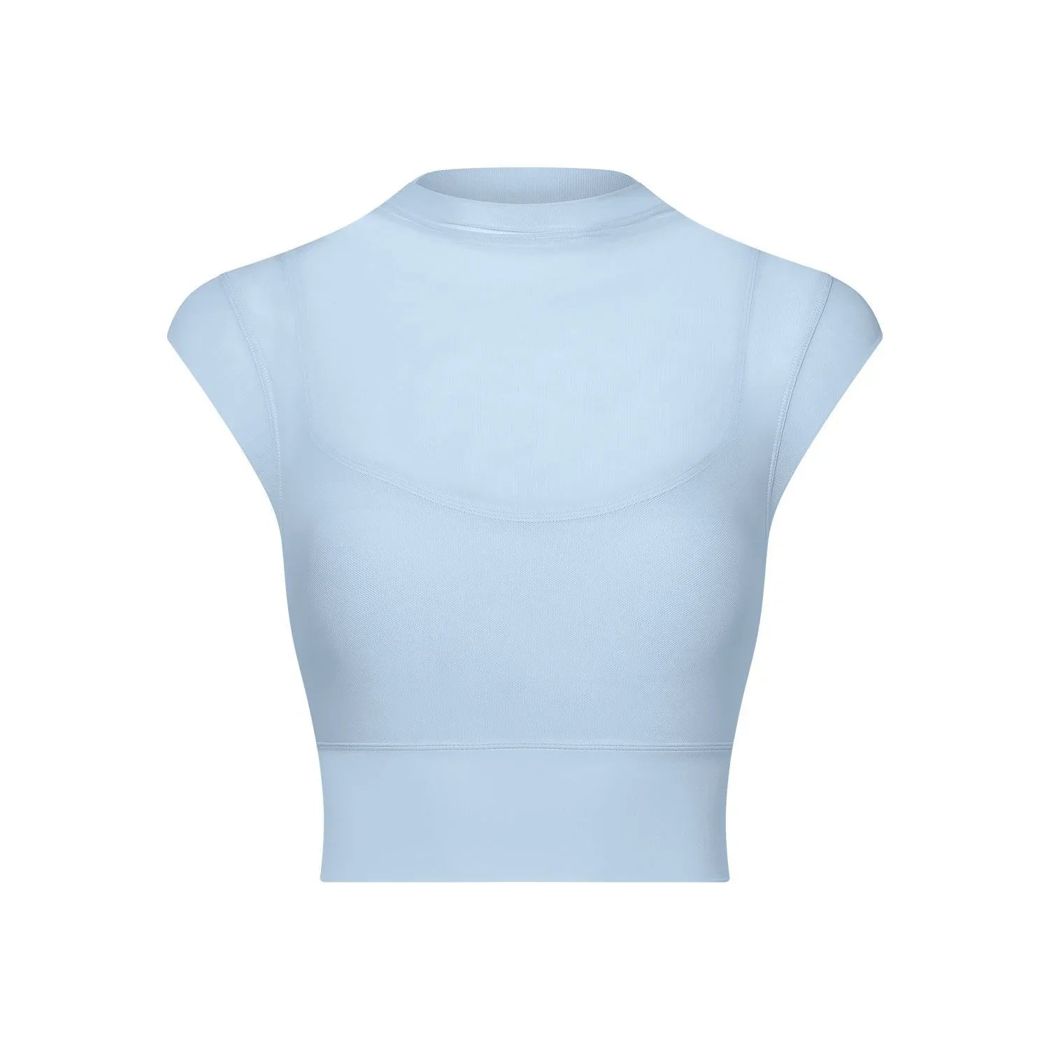 Light blue seamless cropped workout top with cap sleeves and high neckline