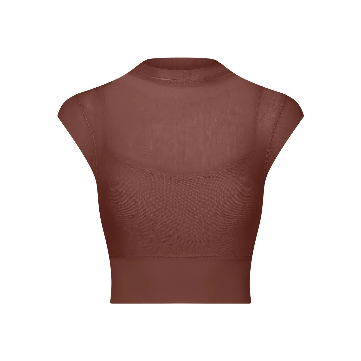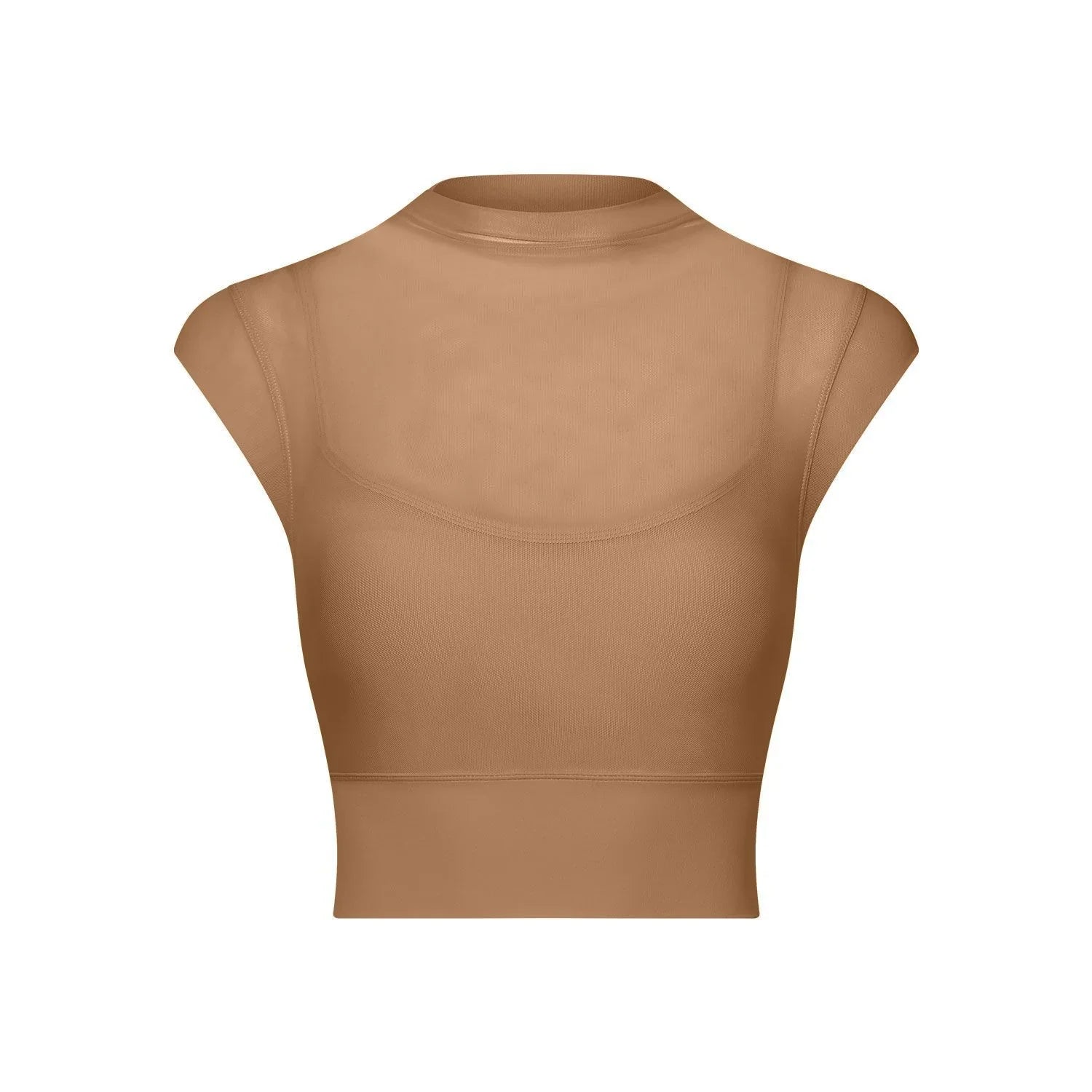 brown cropped mock neck cap sleeve seamless top with stretch fabric