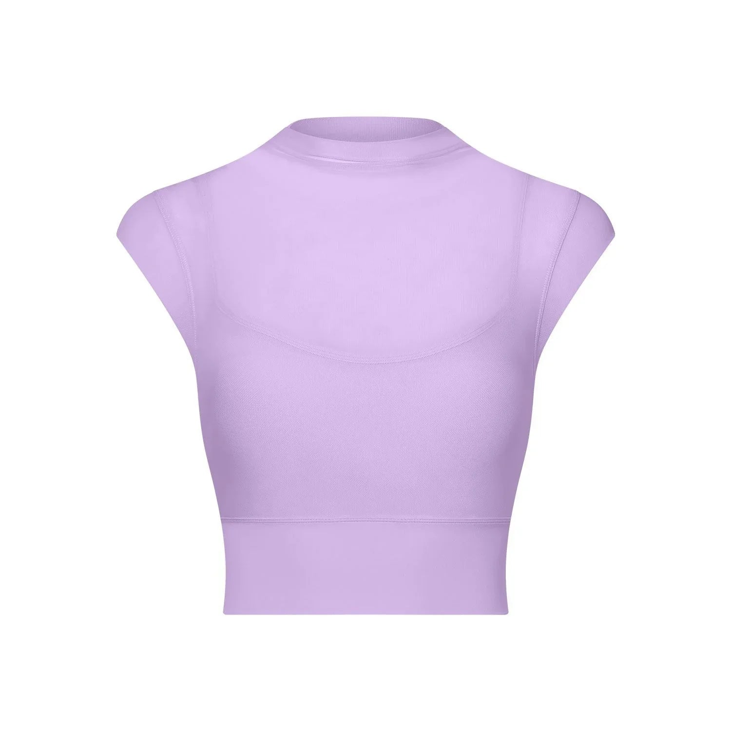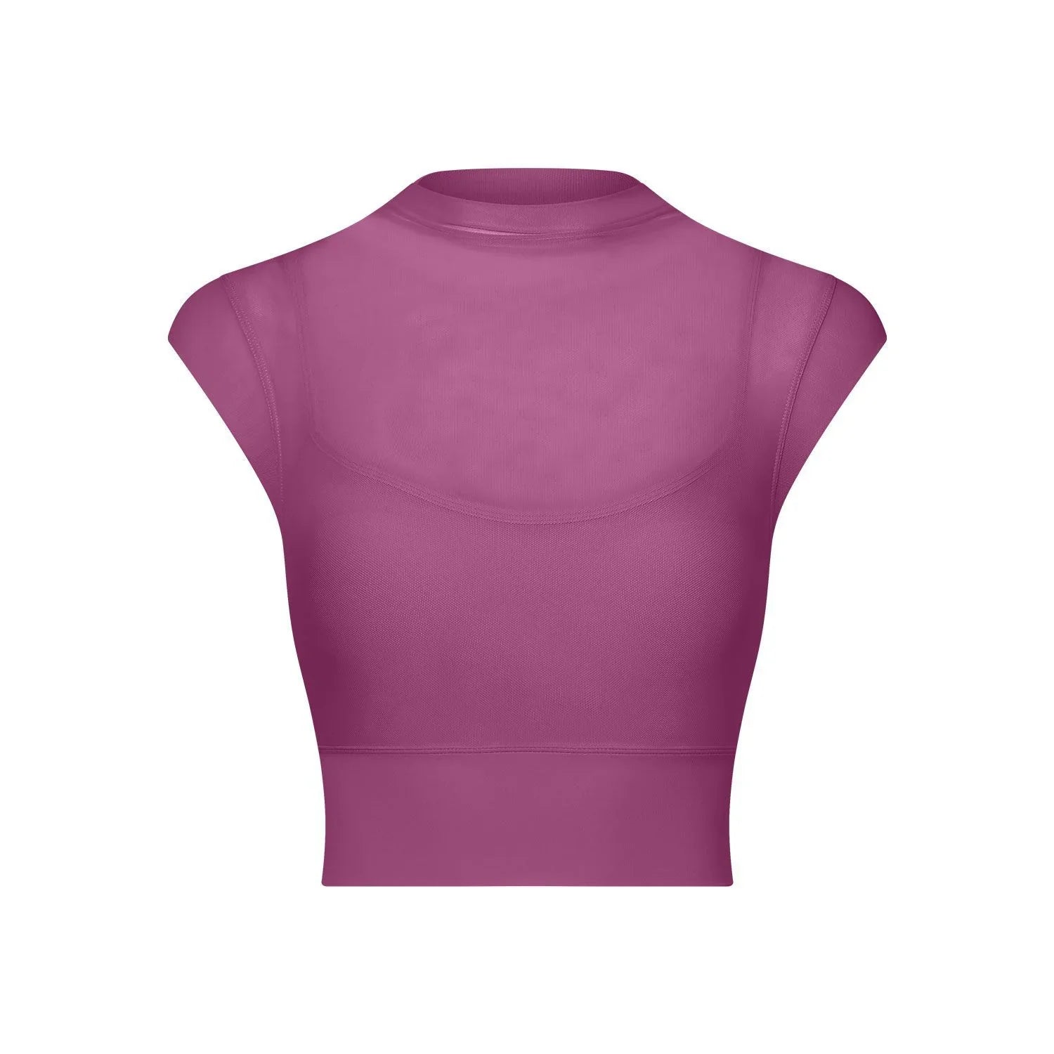 Purple seamless short sleeve crop top with mesh panel and high neckline
