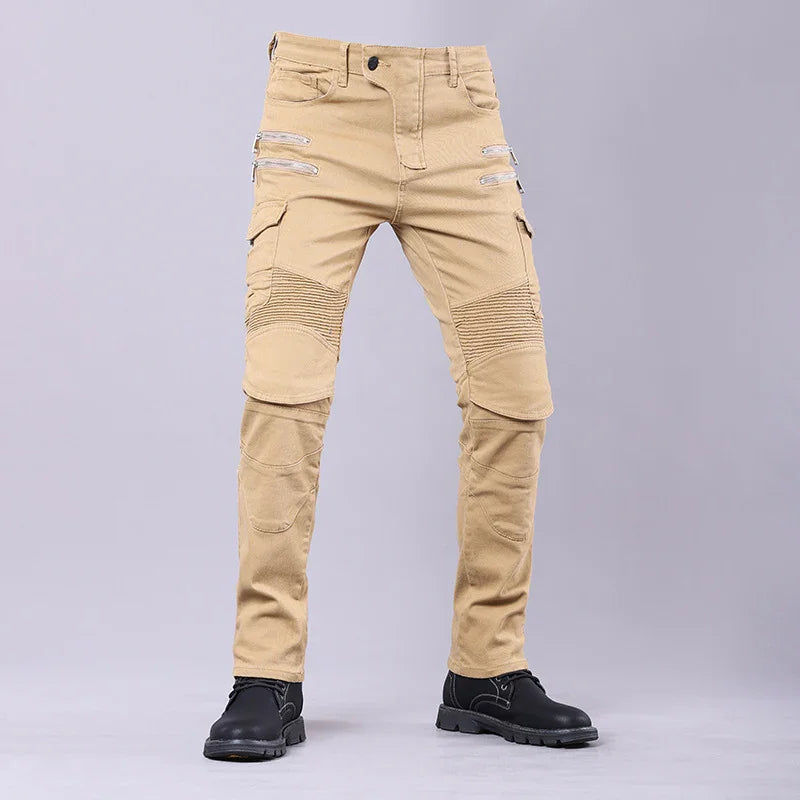 Men's beige cargo biker pants with ribbed knee details and zipper pockets paired with black boots