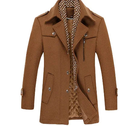 Brown men's wool coat with patterned inner lining, button closure, and zippered chest pocket
