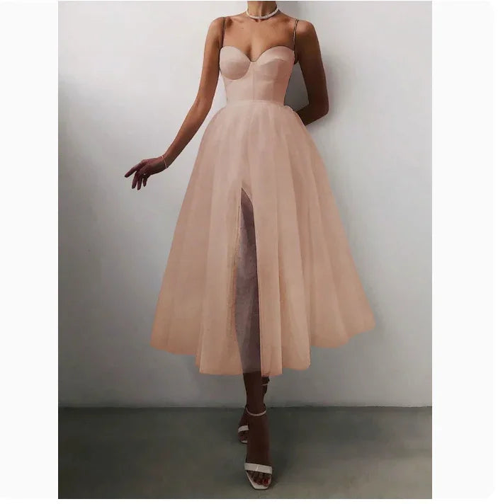Woman wearing elegant white tulle midi dress with sweetheart neckline and slit, posing indoors