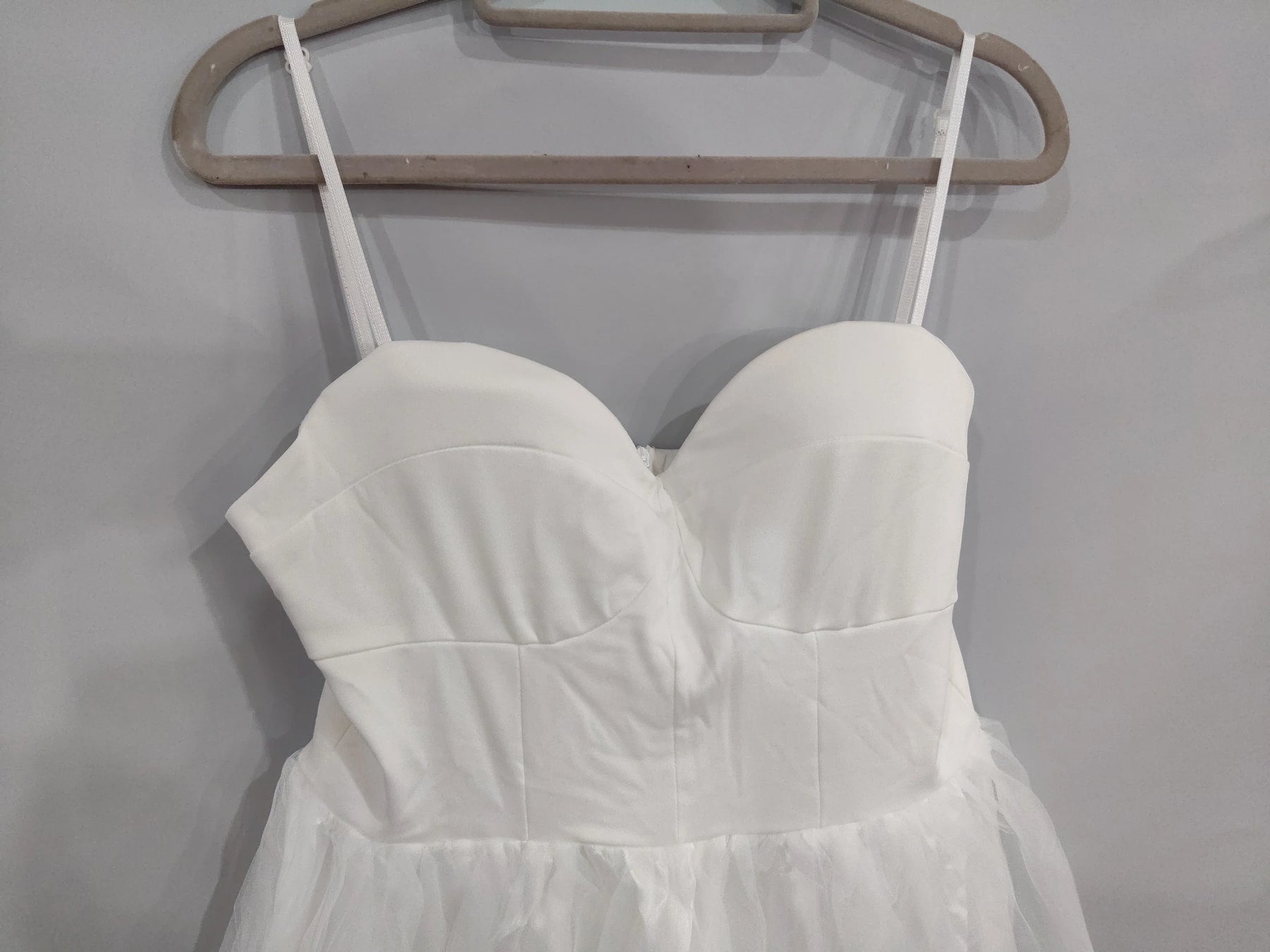Woman in white midi dress with bustier top and tulle skirt with front slit, wearing white heels