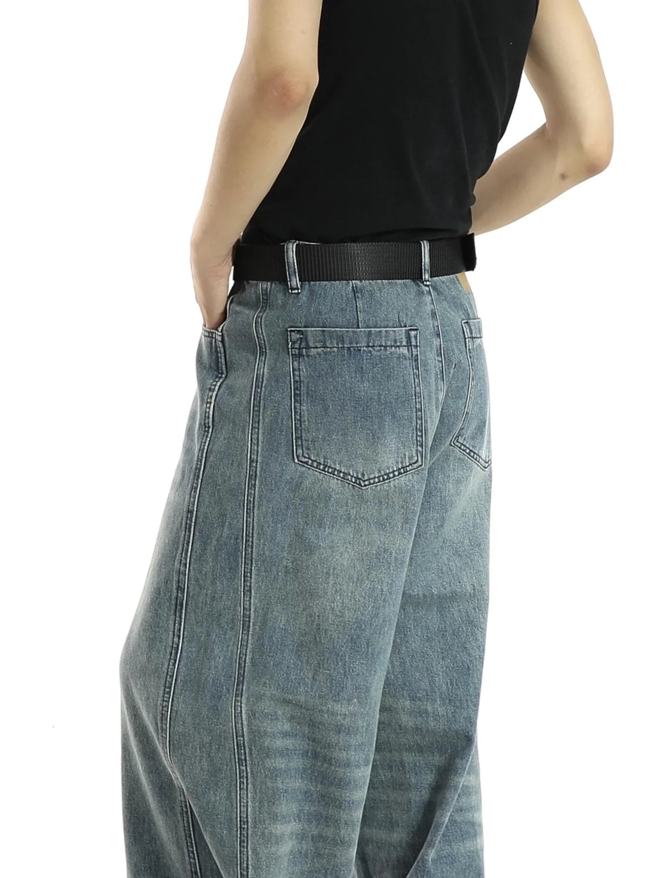Front and side view of person wearing loose baggy blue jeans with black belt and white sneakers