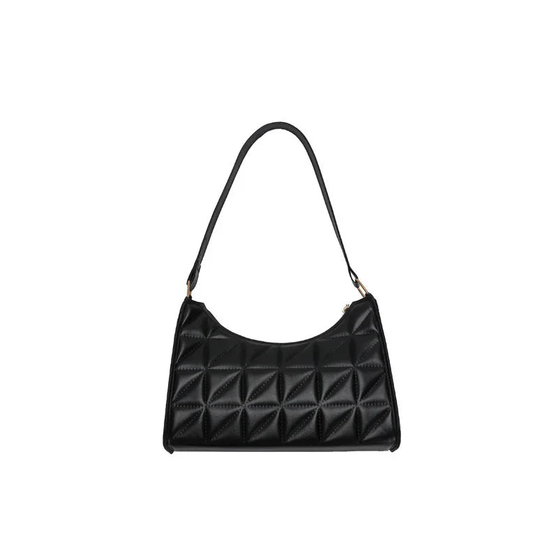 Black quilted leather shoulder bag with geometric stitched pattern and single strap