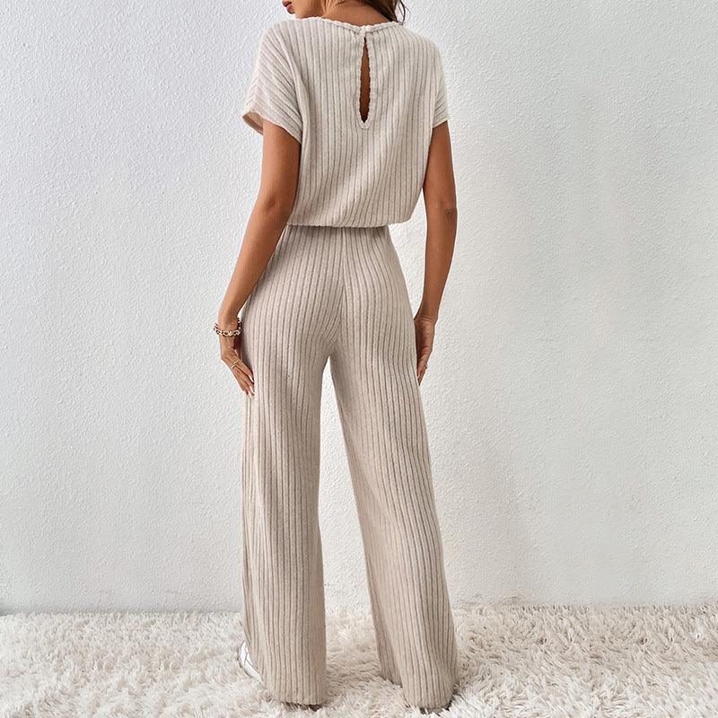 Woman wearing beige ribbed knit two-piece outfit with wide-leg pants and short sleeve top on white textured background