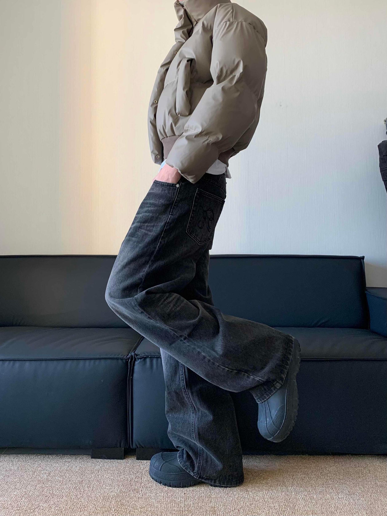 Person wearing a beige puffer jacket, black wide-leg jeans with embroidery, and black chunky shoes indoors