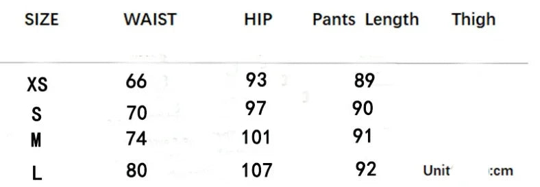 Size chart for pants showing waist, hip, length measurements in cm for sizes XS to L