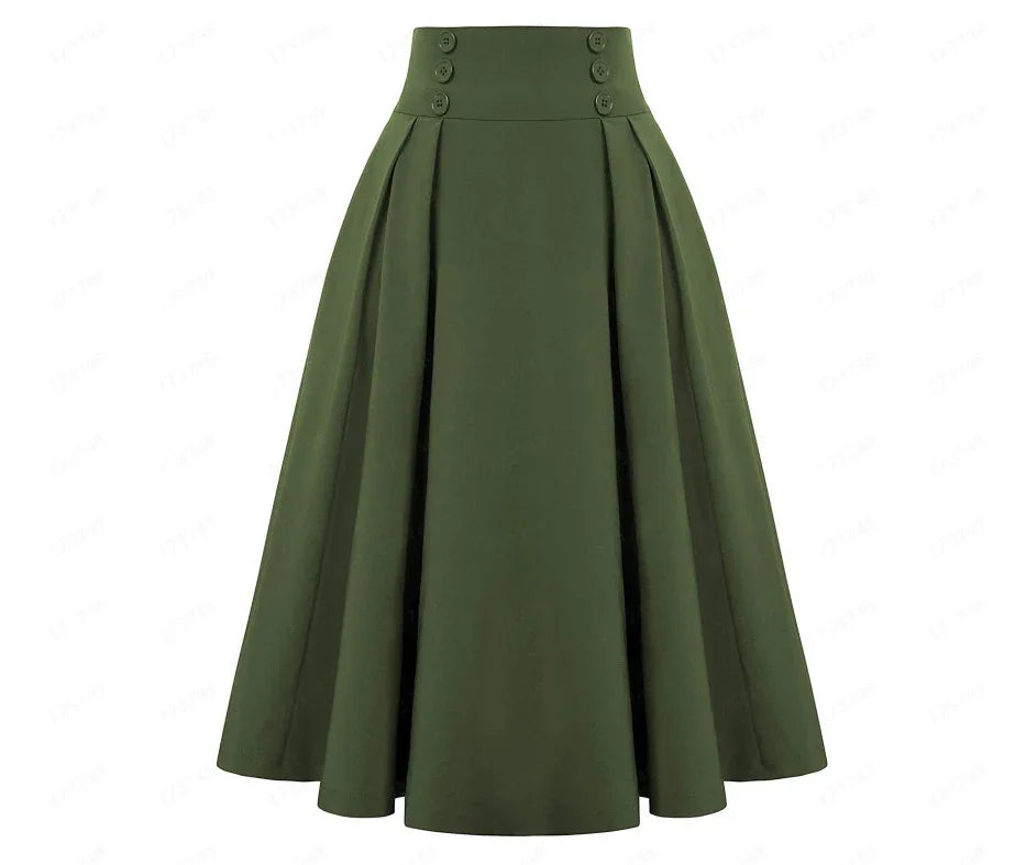 Dark green high-waisted vintage A-line midi skirt with button detailing and pleats