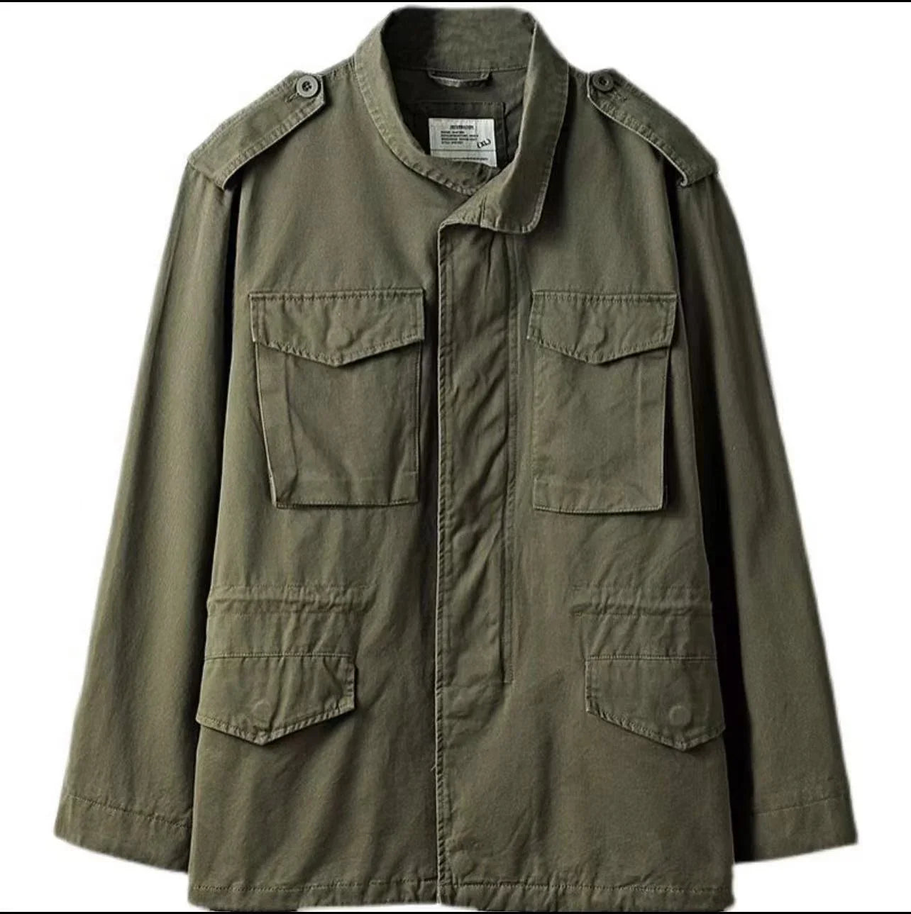 olive green military-style jacket with button shoulder epaulets and four front pockets