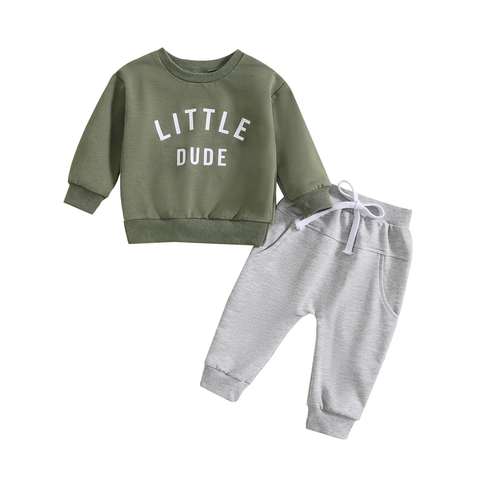 Toddler boy clothing set with green sweatshirt reading 'LITTLE DUDE' and light gray sweatpants