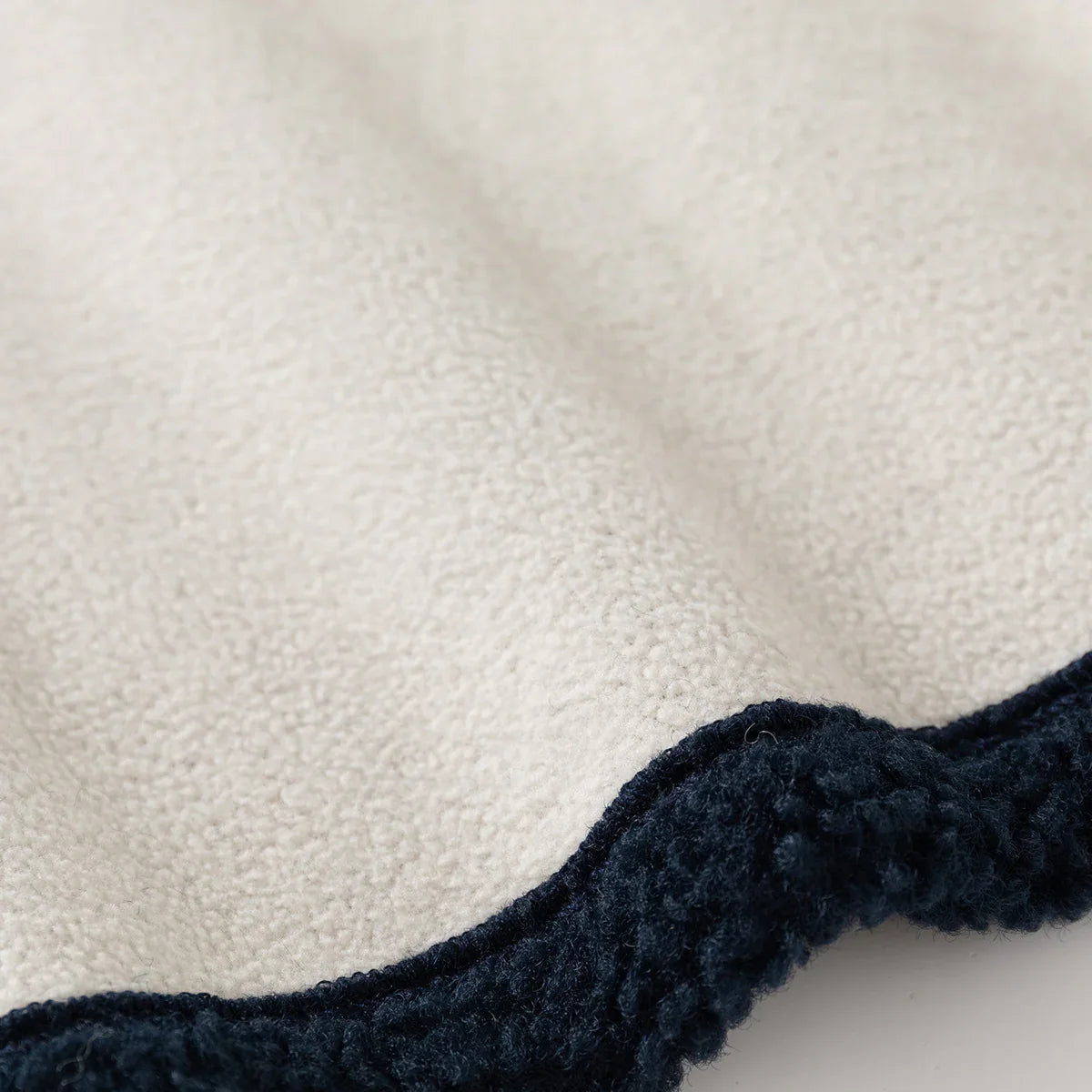 Close-up of textured beige fabric with dark navy blue fleece trim