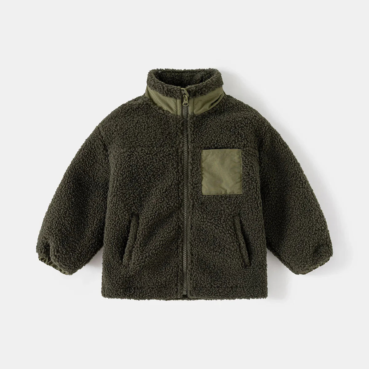 Olive green sherpa fleece jacket with zip front and contrasting chest pocket