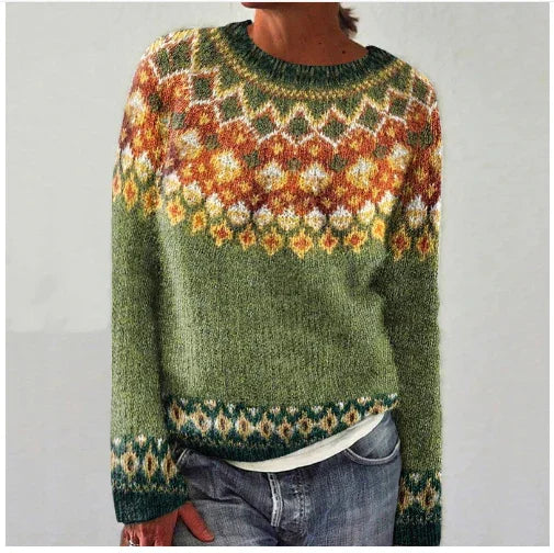 Person wearing a green knit sweater with a colorful patterned yoke in yellow, orange, and white