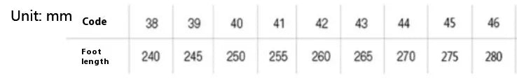 Size chart showing shoe sizes 38 to 46 with corresponding foot lengths in millimeters