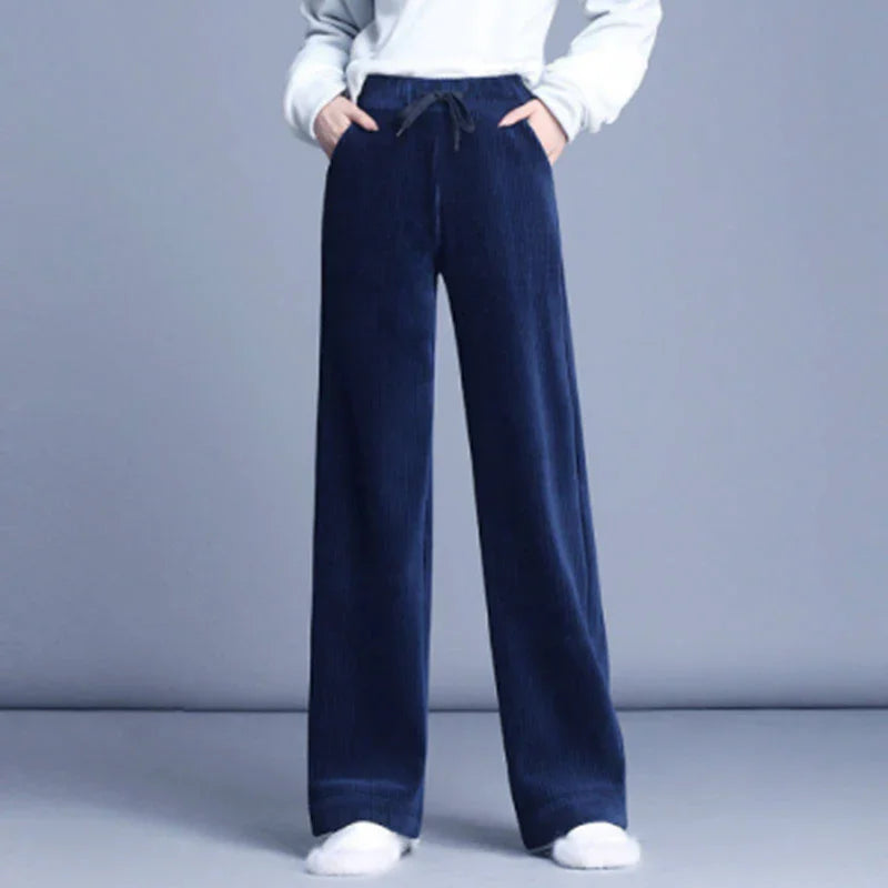 Person wearing navy blue corduroy wide-leg pants with drawstring and white sneakers