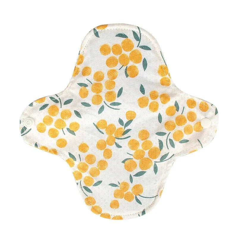 Reusable cloth menstrual pad with yellow floral pattern and snap buttons on sides