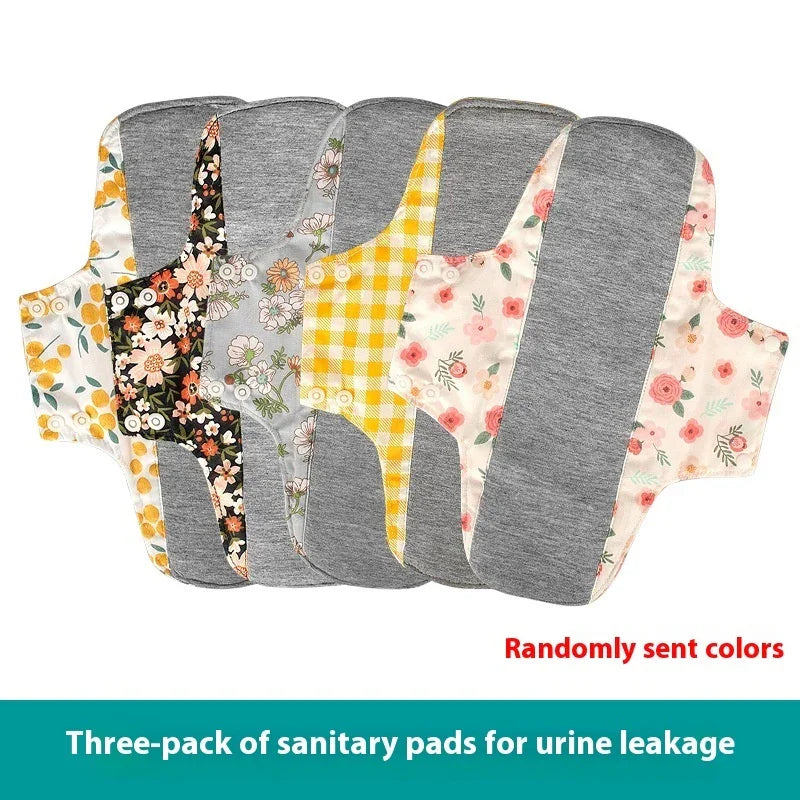 Three-pack of reusable sanitary pads for urine leakage with floral and checkered patterns