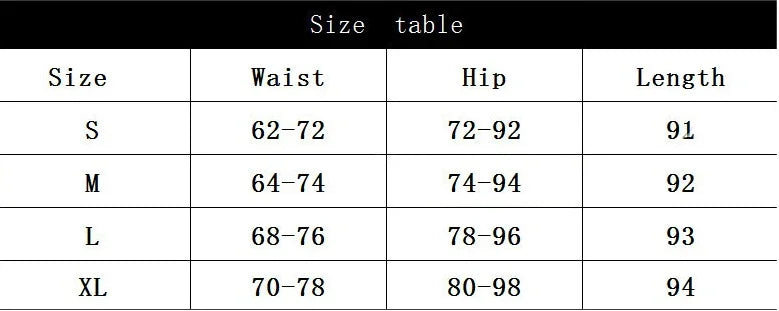 Size chart for clothing showing waist, hip, and length measurements for sizes S to XL