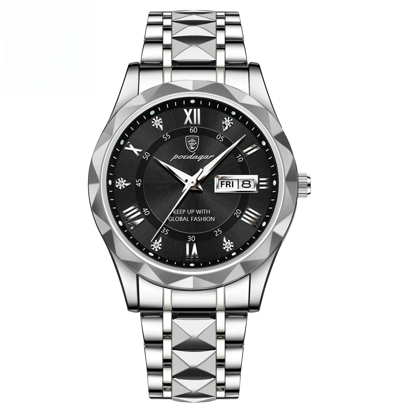 Silver metal wristwatch with black dial, Roman numerals, diamond markers, and date display