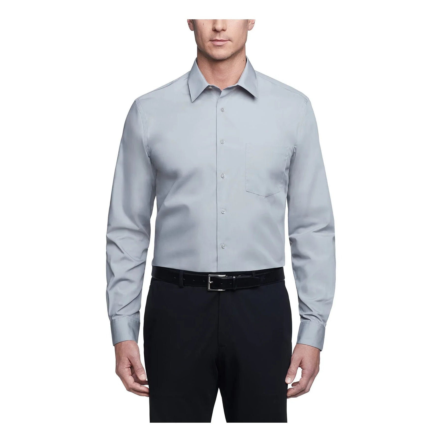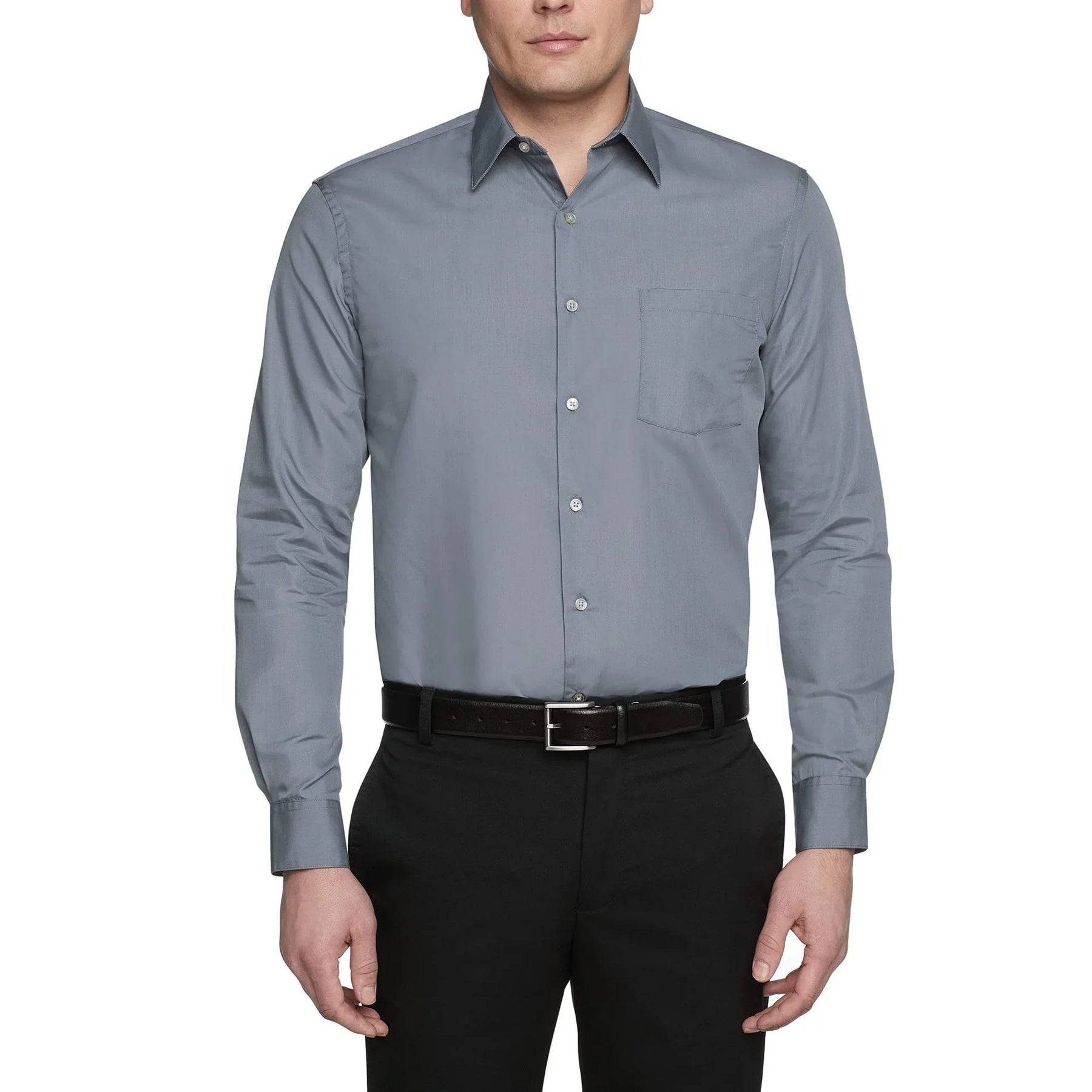 Man wearing light gray long-sleeve dress shirt with front pocket and black pants on white background
