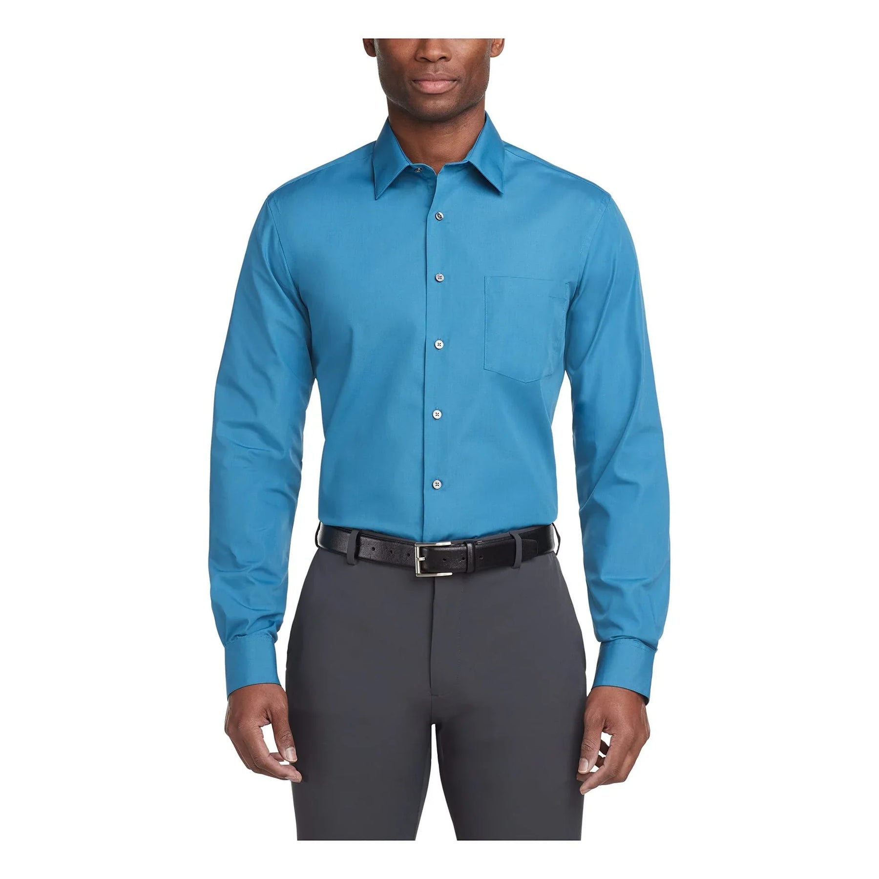 Men's light blue dress shirt with long sleeves paired with black pants and black belt on model