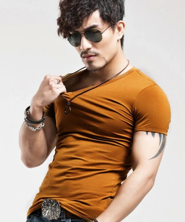 Man wearing brown fitted V-neck T-shirt, sunglasses, necklace, and jeans with ornate belt buckle, showing tattoo