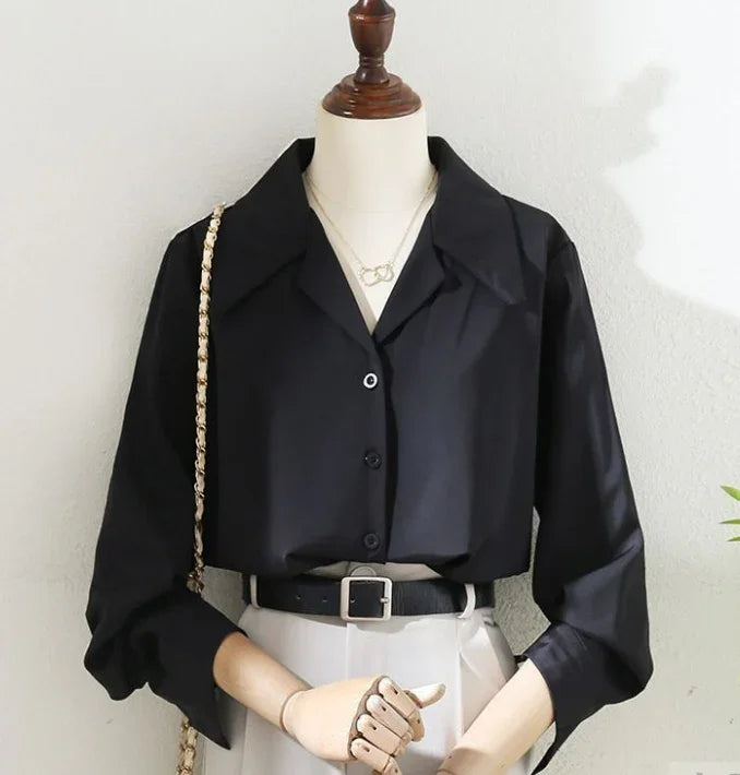 Black button-up long sleeve blouse on mannequin paired with white pants and black belt