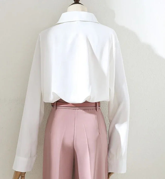 women's white blouse with wide collar tucked into high-waisted pink trousers with gold buckle belt on mannequin