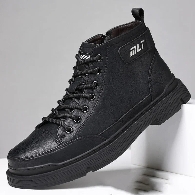 Black high-top leather sneaker with thick sole, lace-up design, and MLT logo on side