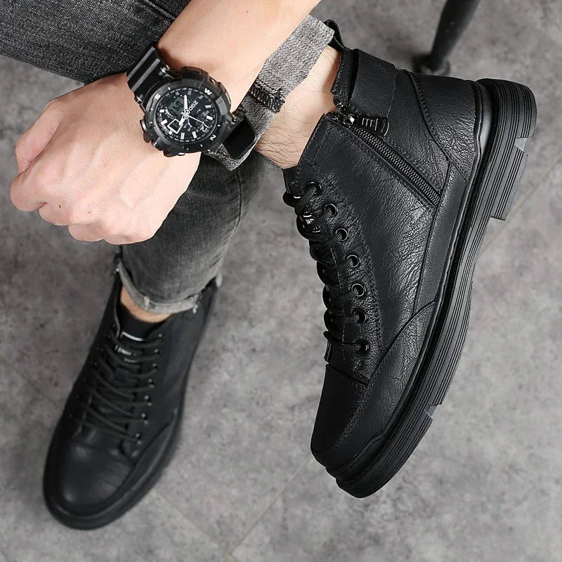 Stylish black high-top leather sneakers with zipper detail worn with rolled dark grey jeans and black wristwatch on grey floor