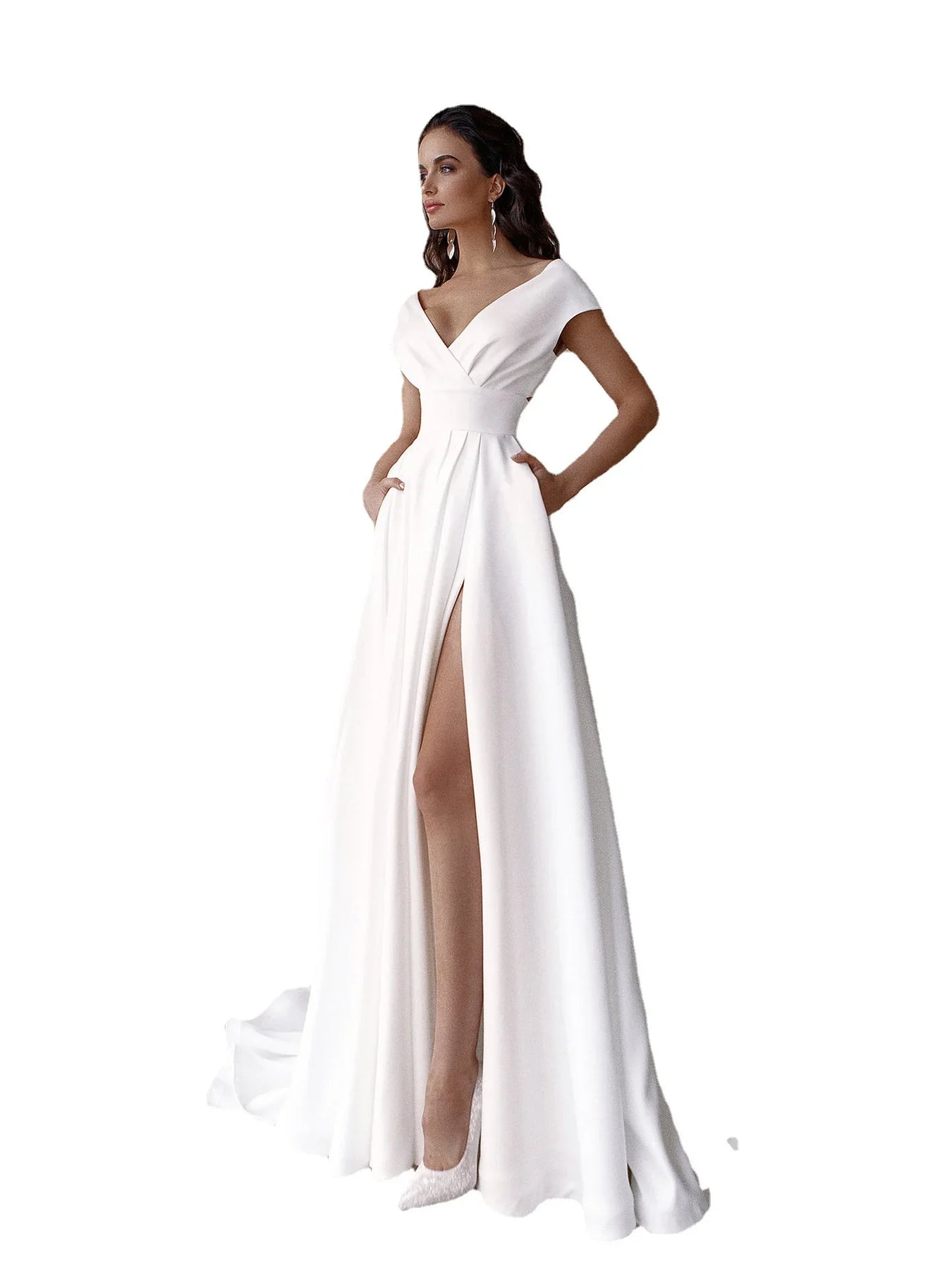 Elegant woman modeling white wedding dress with deep V-neck and thigh-high slit indoors